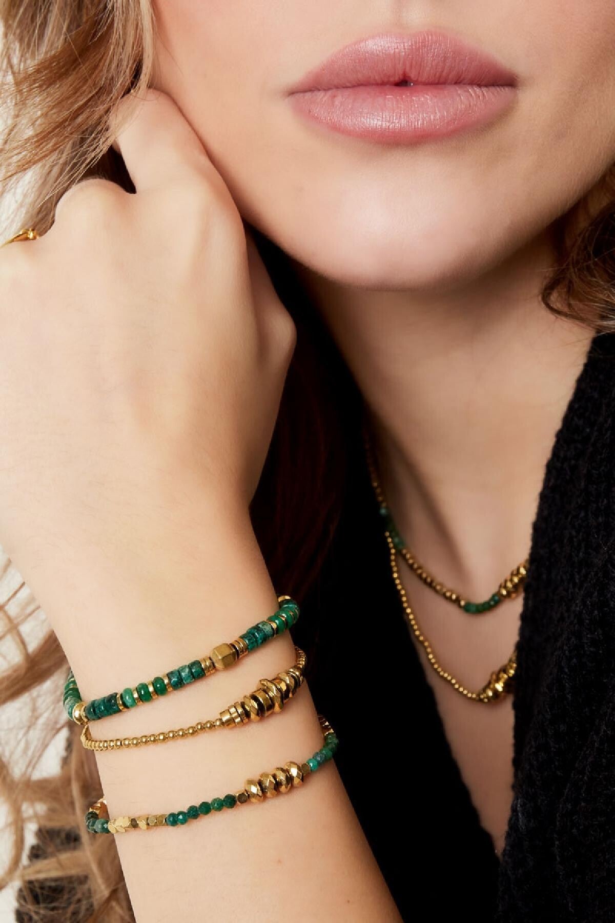 Armband met gouden kraaltjes en groene natuursteen - Hematiet