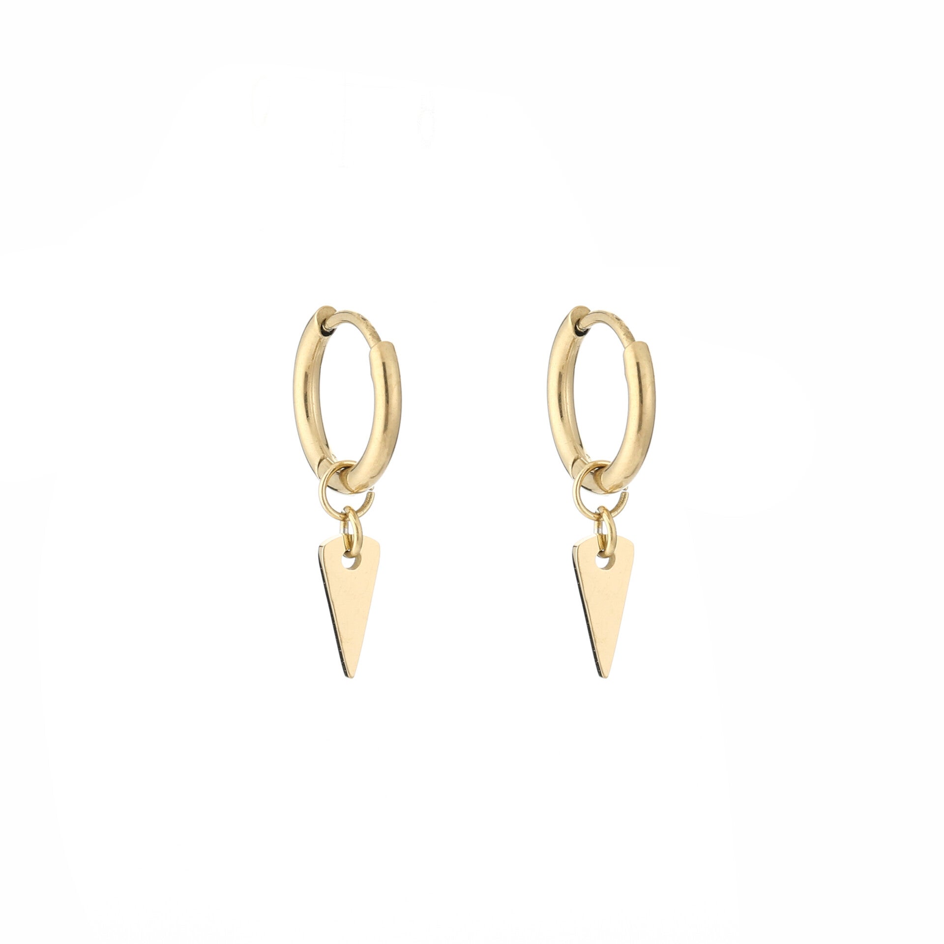 Gouden creolen met een diameter van 1 cm, de hanger in de vorm van een puntje is ook 1 cm.Materiaal: Gold Stainless Steel.