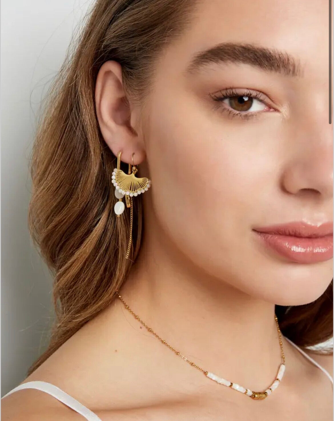 Wauw! Hoe tof zijn deze statement oorbellen met leuke gouden bedel in de vorm van een schelp en witte kraaltjes! Superleuk te dragen tijdens een tof festival of heerlijk avondje terrassen. Wij zijn helemaal verliefd en combineren deze oorbellen graag met meerdere sieraden met witte details! Ook leuk om deze oorbellen te combineren met meerdere kleurrijke accessoires. De oorbellen zijn gemaakt van Stainless steel in combinatie met steen en hebben een afmeting van 2,9 cm.