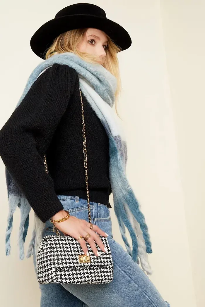 Geruite crossbody tas met een gouden metalen band en sluiting. De tas heeft een Pied de Poule print