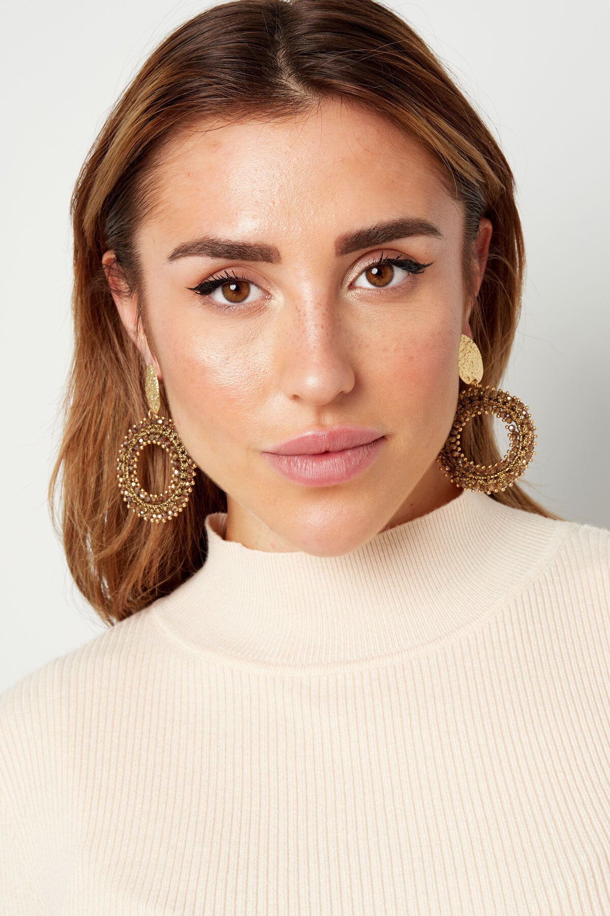 Musthave alert! Hoe leuk zijn deze gouden oorbellen in een ronde vorm met beige kraaltjes! Mega trendy en daarnaast perfect te stylen met meerdere oorbellen; zo kun jij jouw ideale ear party creëren. Daarnaast kun je deze oorbellen ook leuk dragen in combinatie met meerdere sieraden met leuke steentjes. De oorbellen zijn gemaakt van Alloy, koper en kristalkraaltjes en hebben een afmeting van 7 cm.